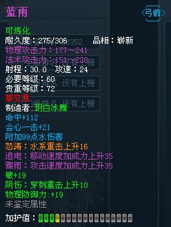 比如说上面那把蓝雨我用的是强敏石、离火石、天攻石组合炼化打造的。不过由于是组合炼化,效果已经发生了改变。